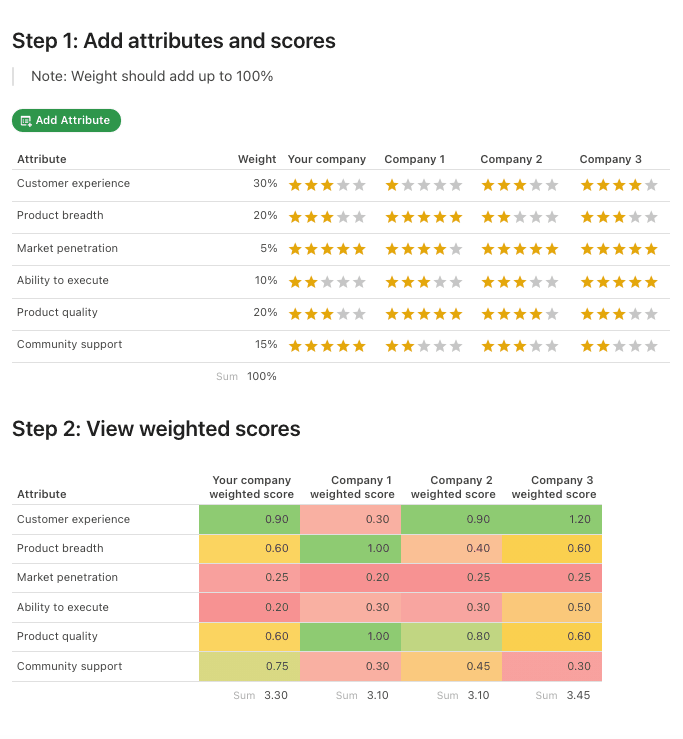 Pro tip: you can also use this template to map out a weighted scoring approach by ranking the importance of each attribute from the customer’s perspective.