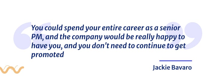 You create a lot of value on your own. And for example, if the work-life balance is more important to you at this point in your career, if you have a side project that you’re really passionate about, you could spend your entire career as a senior PM, and the company would be really happy to have you, and you don’t need to continue to get promoted, to stay at a company. Career success can mean so many different things to different people that that’s an entirely valid approach to your career. I think that, if you make it that far, you should be very proud of what you’ve done and you shouldn’t feel extra pressure to just take on new responsibilities.