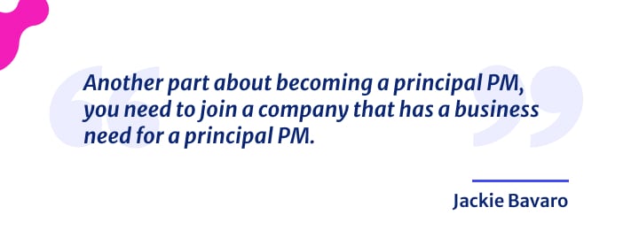 Then there is the principal PM role. So the title between senior PM and principal PM can vary from company to company, but generally what distinguishes a principal PM is that they are an expert in their industry. So they’re not just the best in their company at something, but actually, they’re well-respected in the industry at having been the, being the person, the go-to person in the industry to understand the concept. Another part about becoming a principal PM, you need to join a company that has a business need for a principal PM. So that means they have a business need for somebody who is so advanced, so strategic, so excellent at product skills, execution skills, product strategy, and that the size of the work that they need to be responsible for, to create a large impact that justifies their high salary. But that can be done with a small enough number of engineers, that you don’t need to be a people manager. So in product careers, a lot of times people become people managers because it’s going to take 50 engineers to build your product. And one PM can’t lead that many engineers. Some places where principal PMs are very valued are for example, in high-stakes partnerships. So for example, if Yahoo and Microsoft are partnering on something, that’s the kind of place where you really want a principal PM because the actual amount of product work is small enough for you engineers to handle, but you really can’t afford anything going wrong.