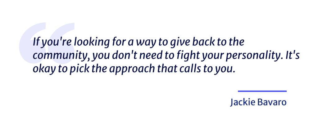 And so if you’re looking for a way to give back to the community and to mentor people, what I would say is that you don’t need to fight your personality. It’s okay to pick the approach that really calls to you. The one that feels like less work to you, the one that you enjoy doing the most. And use that to go forward.