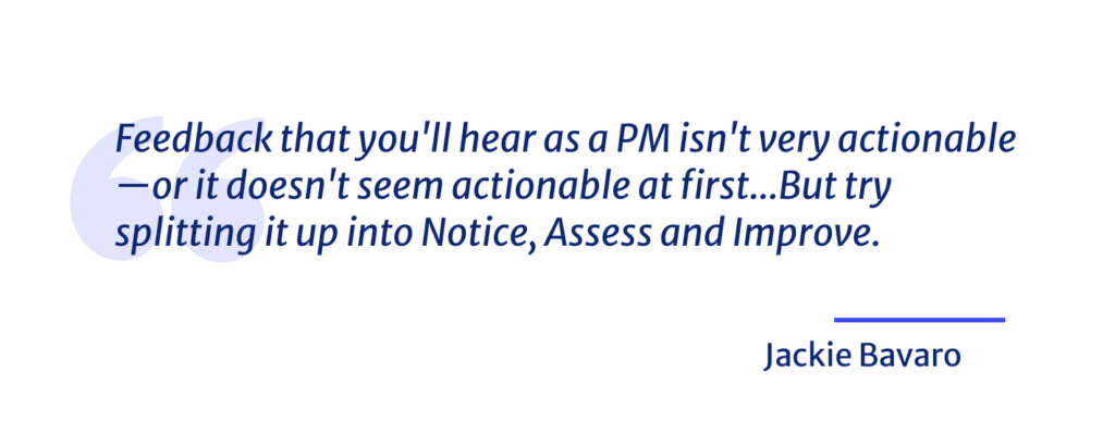 There there’s one framework I put together that I like a lot. I call it Notice, Assess and Improve. And what I found is that the best way to improve as a PM is to get feedback. Especially feedback from your peers, your managers, and also feedback from your managers’ peers. So if you’re at a larger company, for example, the other PM managers are a great source of feedback.