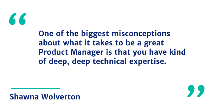 Shawna[00:05:45] Not a lot. But I think it’s one of the biggest misconceptions about what it takes to be a great Product Manager is that you have kind of deep, deep technical expertise. And what I hooked into very early was about wanting to make customers happy. And like, that’s the fire in my gut. I want to delight customers. I want to give them a thing that they love using. And with curiosity and relationship building, it was never, ever an issue for me. Even in my multiple years of working on a technical platform, I couldn’t code my way out of a wet paper bag.