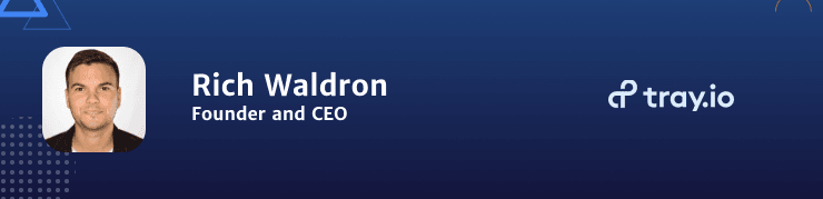 Richard [00:03:02] Sure. Tray.io has been around now since 2012. There were three of us that started the company back then and the division for us, the idea for us, was to enable less technical people to utilize APIs and the technology that we had available to us. Back then, we had this big bet that more and more people were going to consume more and more software and more and more individualized SaaS tools. And as they did, providing configurability via an API would be a huge asset to them.
