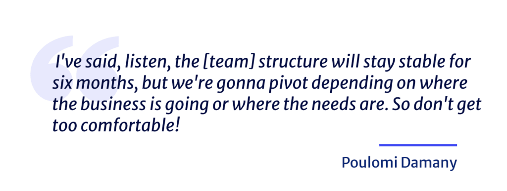 Very much. And I’ve said, listen, the structure will stay stable for six months, but we’re gonna pivot depending on where the business is going or where the needs are. So don’t get too comfortable! I think that’s one thing.