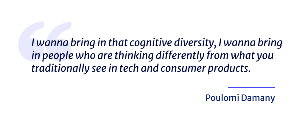 That’s strategy, that’s consumer design, that’s problem solving, collaboration, execution ability. We test for those in the interview process. The other thing I always make sure is that there’s at least one or two women in the interview rounds. Because I wanna bring in that cognitive diversity, I wanna bring in people who are thinking differently from what you traditionally see in tech and consumer products. That’s been important for me.