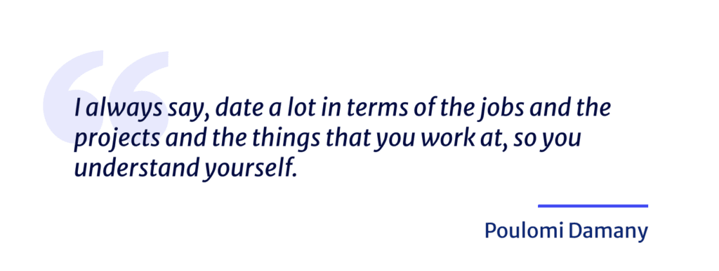 Yeah. I started talking about this. So I think one of them is try a lot of different things. I always say, date a lot in terms of the jobs and the projects and the things that you work at, so you understand yourself. You understand what you’re good at. You understand what you like and what you don’t like, where you need to work on yourself more. I think that’s one.