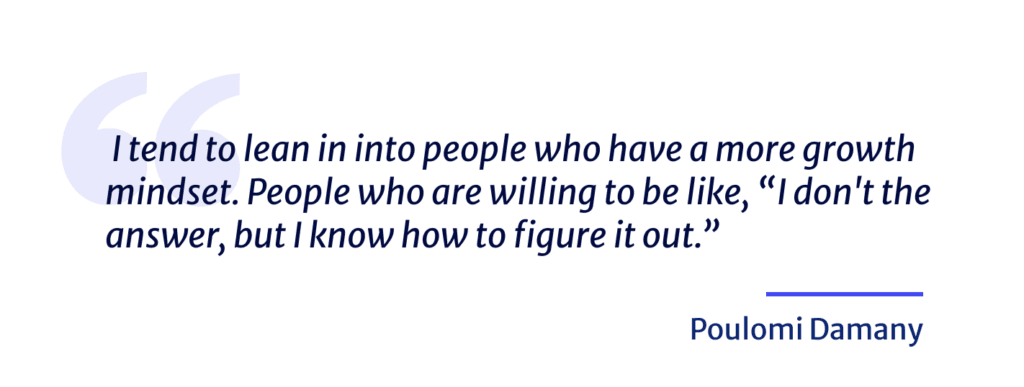 And then I tend to lean in into people who have a more growth mindset. People who are willing to be like, “I don’t the answer, but I know how to figure it out.” As opposed to deep domain expertise. You do need domain expertise in certain areas, particularly in regulated industries. But I feel like that can be learned over somebody’s mindset of like, “How do I approach the problem? How do I keep it bigger and continue to innovate there?”