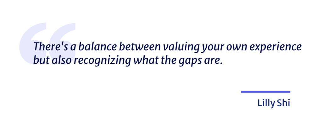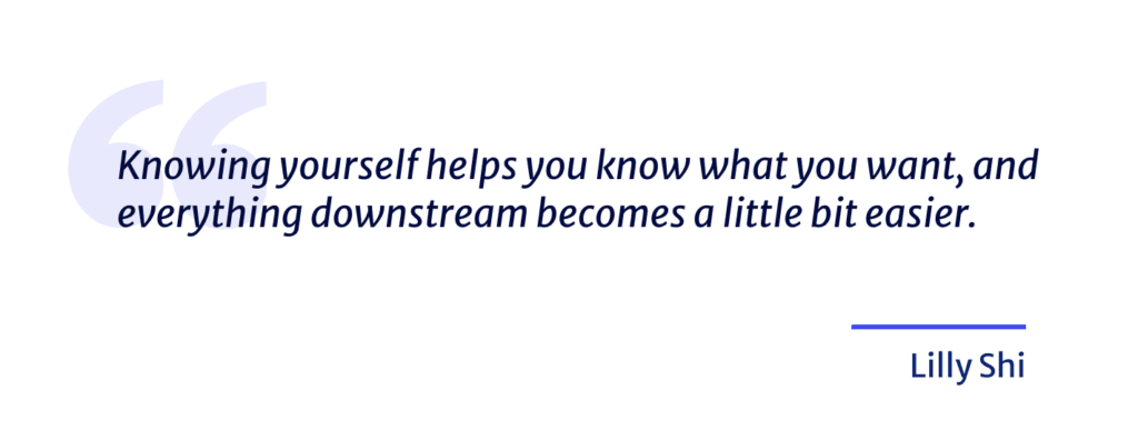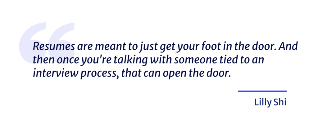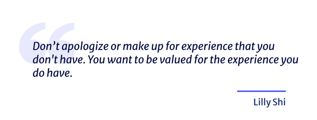 For example, I don’t have an MBA or a CS degree. When I was looking for my first product role, I didn’t apply for anything that required one, because I knew that they weren’t going to be what I was looking for. And vice versa. You don’t want to have to apologize or make up for experience that you don’t have. You want to be valued for the experience you do have, even if you don’t feel like you’re ready.