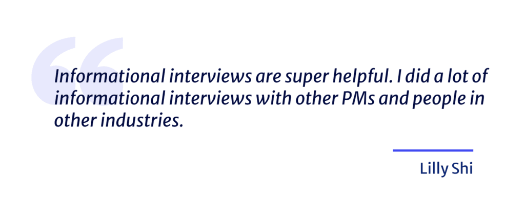 Informational interviews are super helpful. Understanding, for example, that I probably shouldn’t apply for roles that require an MBA and a CS degree. That took me a while to understand and came out of a conversation with a friend who was a PM who had a similar background to me. She walked me through what her process was, where she was like, “Yeah, I found it really hard to get traction in anything that required skills that I didn’t have. And so I really leveraged my UI/UX focus.”