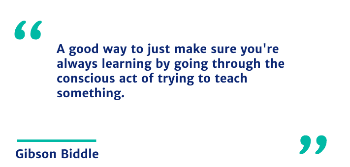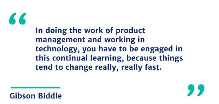 Gibson [00:06:06] I’ve learned a lot and that’s key. I mean, think about how quickly technology changes, and the types of products that you’re building on big shifts. In the beginning, I was just trying to learn how to build stuff. Get engineers and designers and data science-type peeps working together.