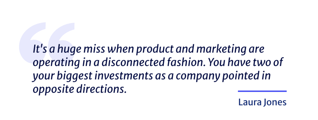 I always think it’s a huge miss when product and marketing are operating in a disconnected fashion. You have two of your biggest investments as a company pointed in opposite directions. And those two investments are your tech team, which is usually a large portion of your head count, and a significant portion of your resources. They may be pointed at one roadmap, but then you have your, your brand media or your media spend pointed in a different direction. That can end up with, I think really disconnected customer experiences, or less effective marketing. Because you’re not really focused in telling a single story across the entire company and to your customer and really being clear what you stand for.