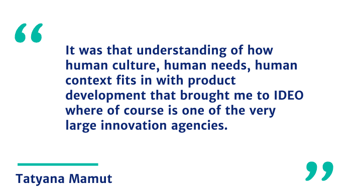 So tie the Ted product needed to be fundamentally rethought, redesigned repackaged repriced. And then again, only then could we figure out the right, advertising to really bring into the Russian market. It was that understanding of how human culture, human needs, human context fits in with product development that brought me to IDEO where of course is one of the very large innovation agencies. And by very large, I mean a couple of hundred people around the world. But it was an incredible place where there was a ton of creativity. Our clients came to us trying to like create the new innovative products.