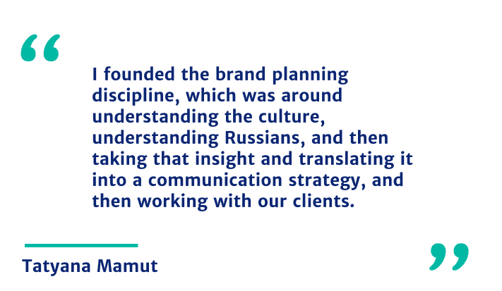 Ironically, I went into advertising after college and into global advertising and I worked at a global ad agency called Leo Burnett where I worked in Chicago, London, and then went, they sent me to Moscow to lead brand planning in Russia. And this was the early two thousand right after the financial collapse in Russia. And Russia was starting to think about how do we develop meaningful, brand experiences, in order to connect with the Russian market and the Russian culture in a unique way. Before that, a lot of advertising in the Russian market was focused on taking ads from the United States or from Western Europe and simply dubbing them into Russian. And that didn’t really work very well. I founded the brand planning discipline, which was around understanding, the culture, understanding Russians, and then taking that insight and translating it into a communication strategy, and then working with our clients. Procter and Gamble was actually my biggest client in Russia. Working with our clients to really craft the right brand messages, the right communications, and also start to adapt the products themselves for the Russian market.