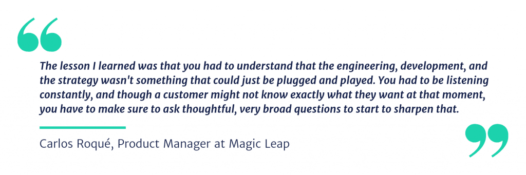 On the minute scale, the smaller one, the lesson I learned was that you had to understand that the engineering, development, and the strategy wasn’t something that could just be plugged and played. You had to be listening constantly, and though a customer might not know exactly what they want at that moment, you have to make sure to ask thoughtful, very broad questions to start to sharpen that.