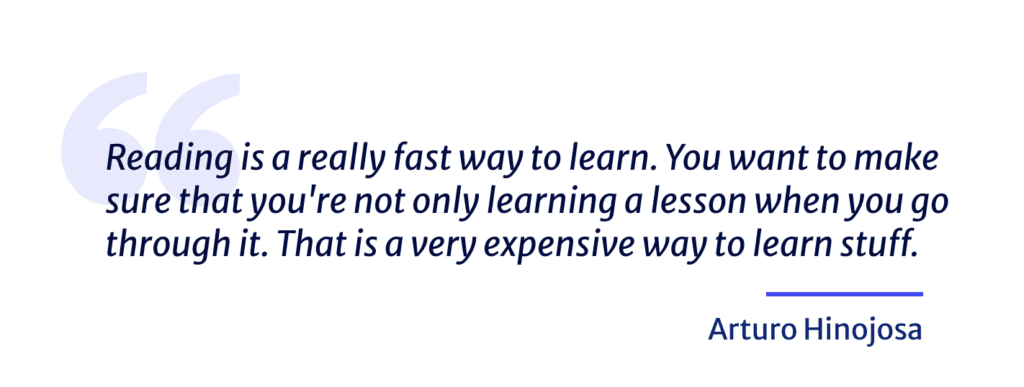 You want to make sure that you’re not stuck in a position where you only learn a lesson when you go through it. That is a very expensive way to learn stuff. You can stand on the shoulders of giants, learn what others have done learn techniques for messaging, how that works, learning different pricing and all that stuff. Like all that stuff’s been written in books ad nausea. So read the books, I’m sure there’s book lists out there, read all the VC books. Like all those do pretty good job of talking about Product Management challenges, growing a company, growing a business, growing on opportunity. Reading is a really fast way to learn because you’re able to digest a lot of other really good experience very quickly and apply it.